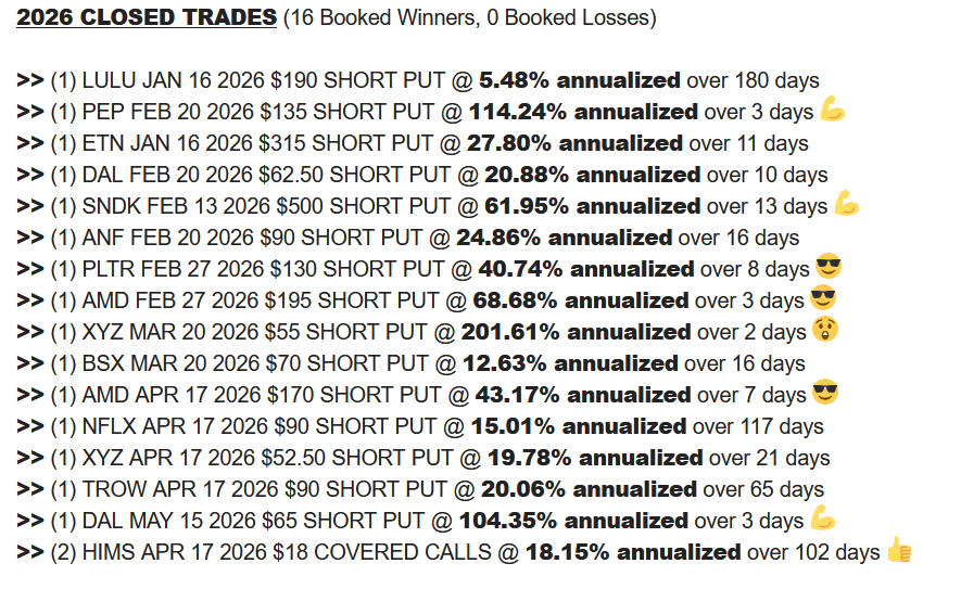 2026 LIC Closed Trades (16 Wins, 0 Booked Losses thru 4/21/2026)